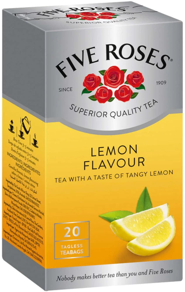Five Roses Lemon Flavour Tea blends smooth South African black tea with a bright hint of tangy lemon to create a refreshing yet comforting cup. Designed for everyday enjoyment, each tagless teabag delivers consistent flavour that can be enjoyed hot or chilled. The balanced citrus note adds lift without overpowering the tea, making it an easy choice for any time of day. Trusted for its quality and heritage, this tea brings a touch of brightness to daily routines while remaining familiar and dependable.